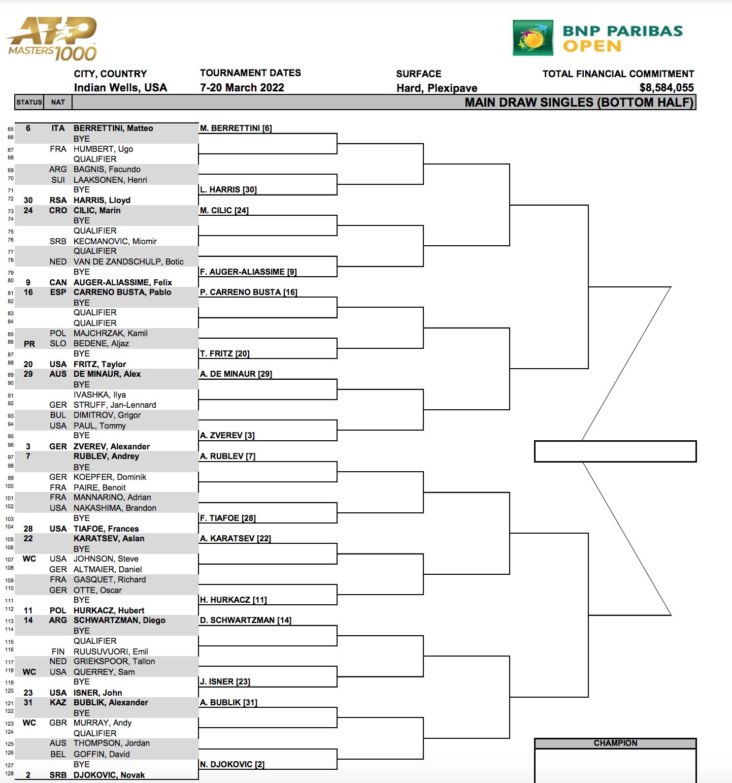 北京时间3月9日。2022ATP1000大师赛印第安维尔斯站公布了男单正赛签表。刚刚登顶世界第一的俄罗斯名将梅德韦杰夫作为赛会头号种子领衔出战;备受关注的塞尔维亚名将德约科维奇目前仍在签表中,他将作为赛会2号种子出战。赛事组委会目前仍在与德约的团队沟通确认美国疾控中心CDC是否允许他在未接种新冠疫苗的情况下进入美国参赛。兹维列夫、纳达尔、西西帕斯、贝雷蒂尼、卢布列夫、鲁德分列3-8号种子。