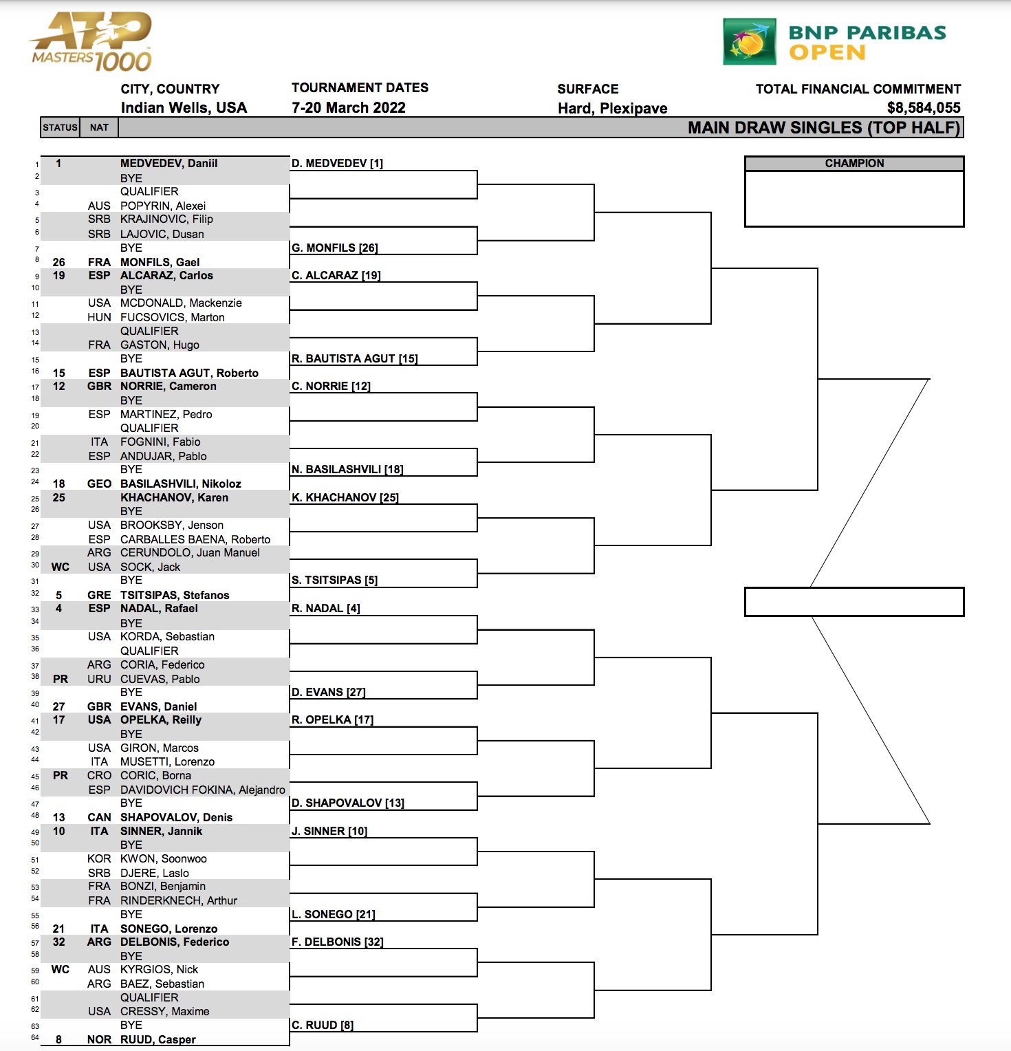 焦点对阵方面,新科世界第一梅德韦杰夫第三轮潜在对手是法国人孟菲尔斯;第四轮或将遭遇近来上升势头明显的西班牙超新星阿尔卡拉斯。梅德韦杰夫在印第安维尔斯需打进八强才能保住No.1。否则德约将在两周后重返世界第一。新赛季豪取开局15连胜的纳达尔或在第二轮遭遇美国新星科达。德约如能正常参赛,他或将在第二轮迎战比利时选手戈芬,后者将在首轮遭遇澳洲选手汤普森。