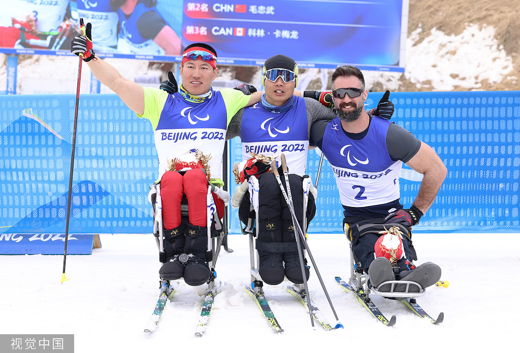 在下午举行的残奥冬季两项男子短距离-坐姿决赛中,中国队两名选手包揽金银牌!其中郑鹏以2:42.4的成绩夺得金牌,毛忠武以2:44.9的成绩获得银牌,加拿大选手科林·卡梅龙以2:46.3的成绩获得铜牌。