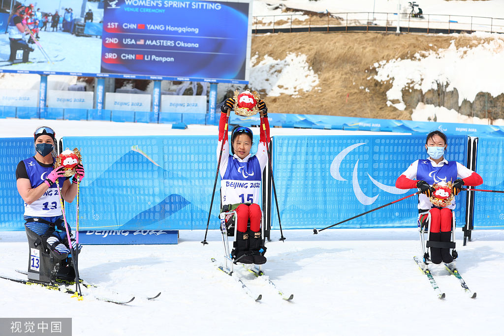 不到10分钟后结束的残奥冬季两项女子短距离-坐姿决赛中,中国两名选手包揽金牌、铜牌!中国代表团在10分钟内收获2金1银1铜!其中杨洪琼以3:18.2的成绩获得金牌,美国选手奥克萨娜·马斯特斯以3:19.9的成绩获得银牌,李盼盼以3:31.0的成绩获得铜牌。