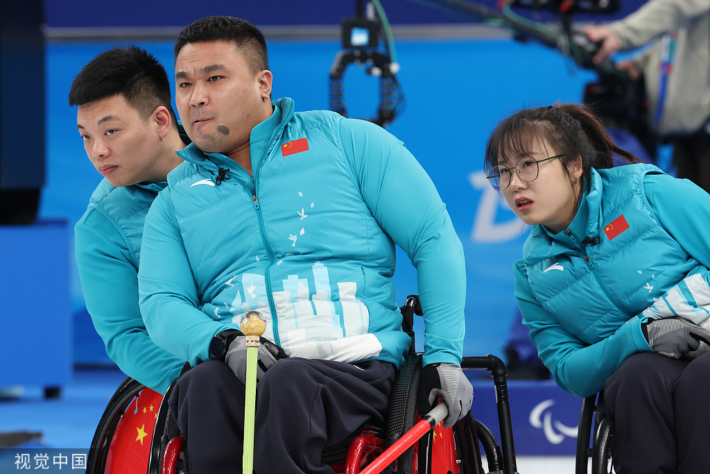 今天中国轮椅冰壶队迎来一日双赛。由闫卓、张明亮、陈建新、王海涛组成的轮椅冰壶队在早上对阵斯洛伐克队时,凭借第5和第6局分别获得2分、3分,在第7局结束时领先斯洛伐克队2分,提前以7-5战胜斯洛伐克队。