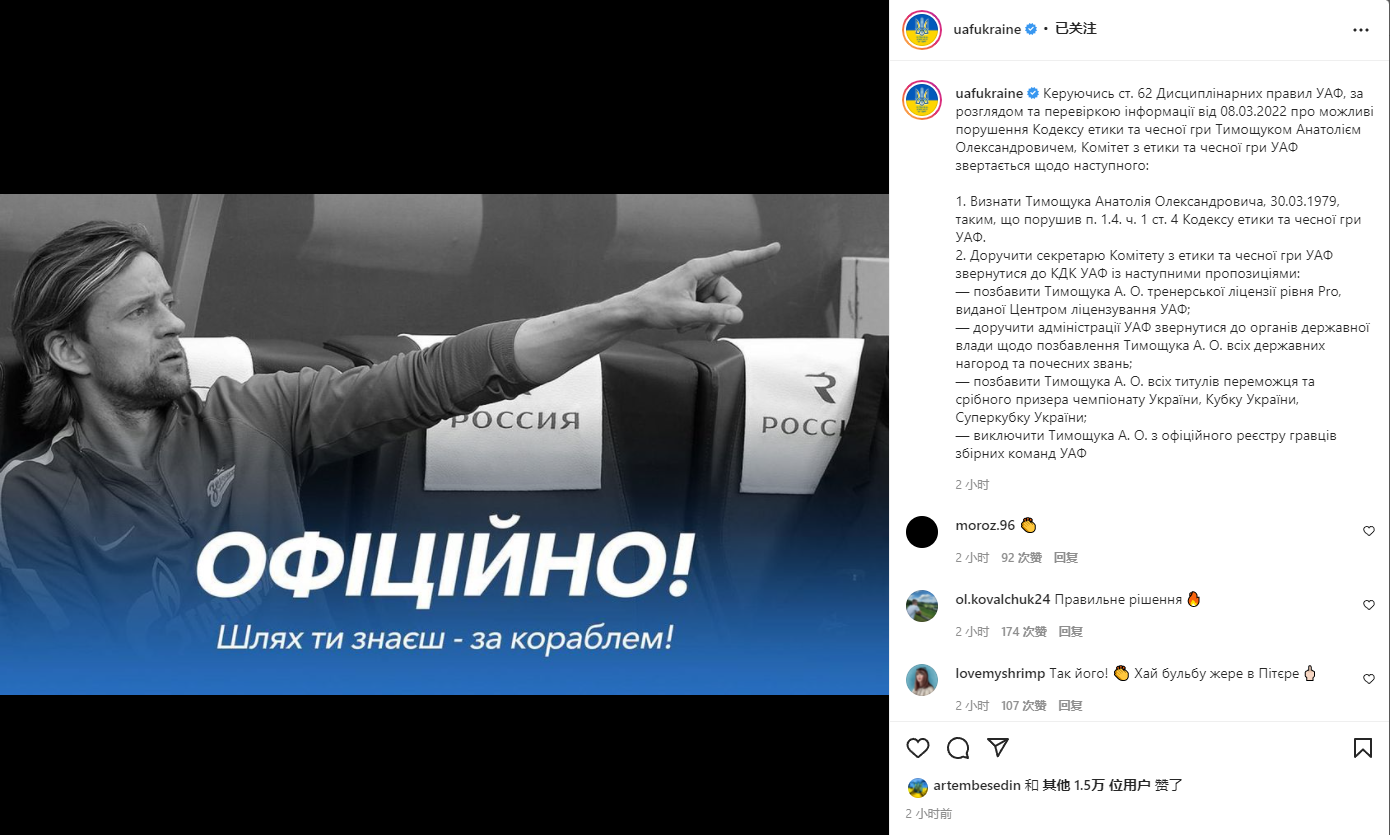 乌克兰足协官方称,目前仍在俄超泽尼特担任助理教练的季莫什丘克被乌克兰足协纪律委员会以及公平竞赛协会指控,称这位传奇球星涉嫌违反足协相关规定。如今足协官方为季莫什丘克“定性”:“出生于1979年3月30日的阿纳托利-亚历山德罗维奇-季莫什丘克违反了乌克兰足协相关规定的条款”,因此提议将其从国家队除名,并剥夺其在乌克兰所获得的一切荣誉。