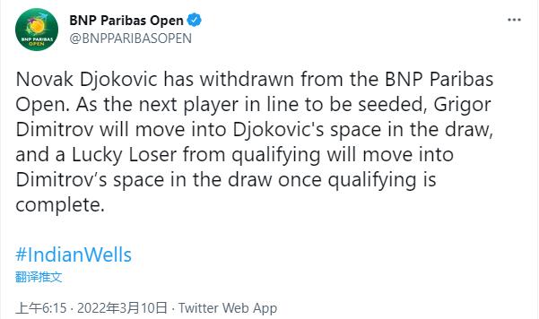 北京时间3月10日消息。塞尔维亚网球名将德约科维奇通过个人社交媒体宣布,由于美国的新冠疫苗接种政策,他将无法进入该国参加印第安维尔斯及迈阿密两站大师赛的争夺。随后印第安维尔斯大师赛组委会也通过官方社交媒体账号确认了这一消息。根据官方公布的应对方案,保加利亚名将迪米特洛夫将成为33号种子顶替德约签表上2号种子的位置。资格赛幸运落败者将顶替迪米的位置!