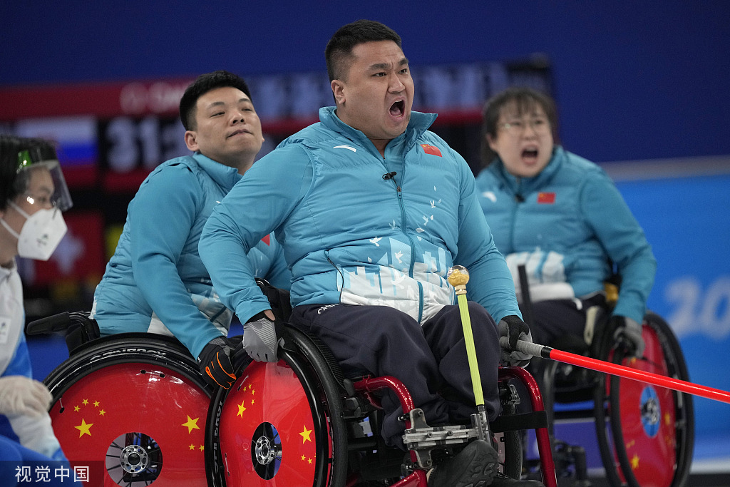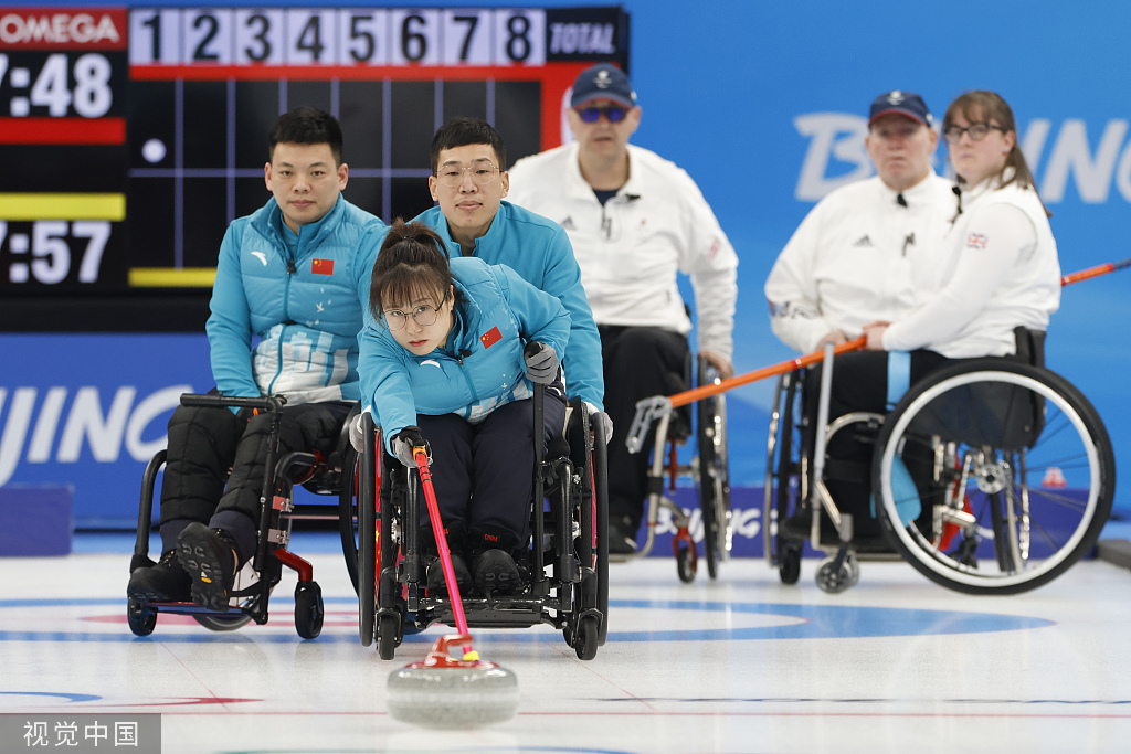 在上午对阵英国队的比赛中,由闫卓、张明亮、陈建新、王海涛组成的中国队,没有给英国队很多机会。他们在7局比赛中只让英国队两局得分,并且在后三局连续得分,在第7局结束时已6-3领先英国队,让比赛提前结束,没有进入第8局。中国轮椅冰壶队豪取7连胜,并提前进入四强。