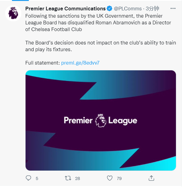 北京时间3月12日,英超官方宣布取消阿布担任切尔西董事的资格。英超联赛官方在公告中写道:”在英国政府进行制裁之后,英超董事会已经取消了阿布拉莫维奇担任切尔西俱乐部董事的资格。根据英国政府颁发的许可规定,董事会的决议不影响俱乐部的训练以及比赛,这份许可于5月31日到期。“