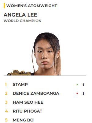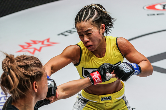 3月26日“ONE:X”战卡群星云集,女子原子量级的竞争尤为激烈,除了一场巴西柔术美女丹尼尔-凯莉与山口芽生的缠斗降服赛外,共有三场综合格斗比赛。当晚头条主赛由原子量级世界冠军“势不可挡”李胜珠与原子量级世界八人赛冠军斯坦普争夺“一姐”之位,另外两场综合格斗比赛分别是:目前级别排名第二的菲律宾“狼女王”丹妮丝-三宝颜与排名第三的韩国“阿拉蕾”韩瑞熙上演二番战、保持不败金身的“人造人18号”平田树对战上升势头正猛的“影猫”吉辛-拉德赞。