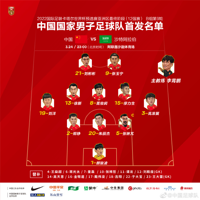 国足vs沙特首发阵容:
