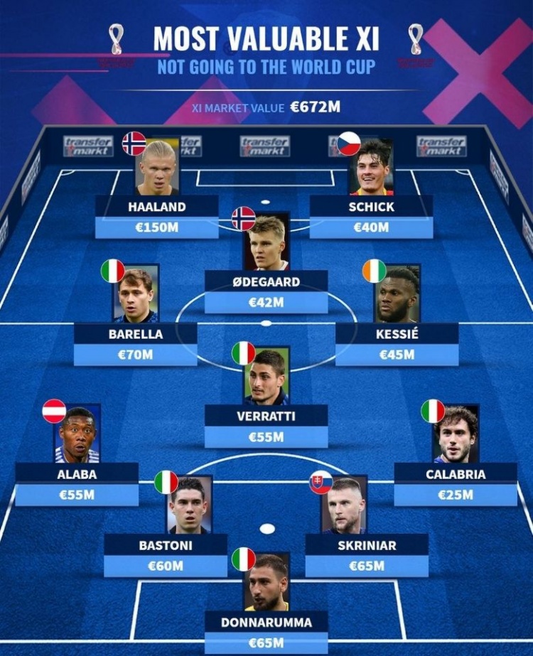 这份名单中球员的总身价超过了6亿欧元,单单是身价最高的哈兰德一人身价就达到了1.5亿,用群星璀璨来形容好不为过。这些球员集体无缘世界杯决赛圈,不得不说是一件十分遗憾的事情。
