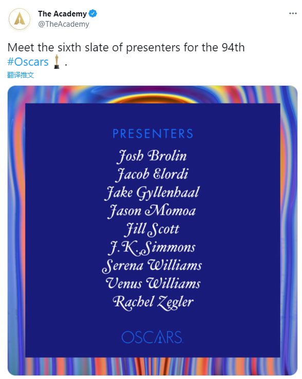 第94届奥斯卡颁奖礼将于美国当地时间3月27日在洛杉矶杜比剧院举行。此前,奥斯卡官方公布了本届颁奖礼的第6批颁奖嘉宾,网坛传奇大、小威廉姆斯位列其中。