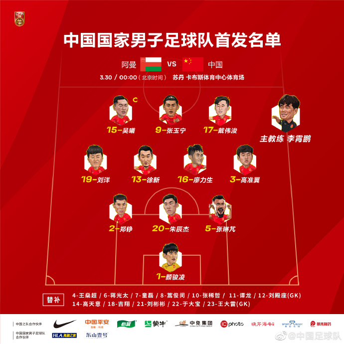 国足首发:1-颜骏凌、2-郑铮、3-高准翼、5-张琳芃、19-刘洋、20-朱辰杰、13-徐新、15-吴曦、16-廖力生、17-戴伟浚、9-张玉宁