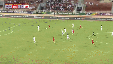 第57分钟,阿曼边路打穿国足防线,门前的铲射击中边网。