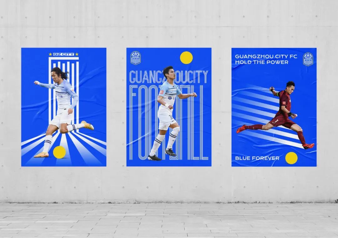 「视觉延展」——在视觉延展上,富有动感与变化的「广州」发射状线条适用于多种应用场景,营造出足球运动的速度与激情。