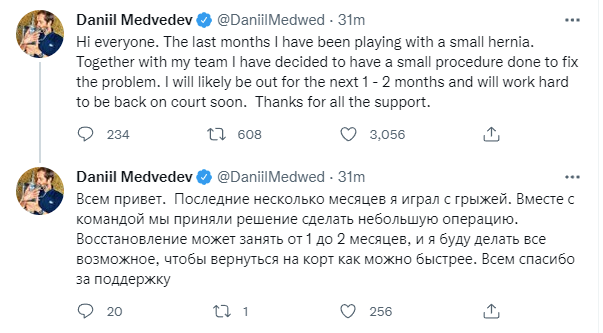 北京时间4月2日消息,ATP世界第二梅德韦杰夫在社交媒体宣布,自己因为进行疝气手术将缺席赛场1-2个月。