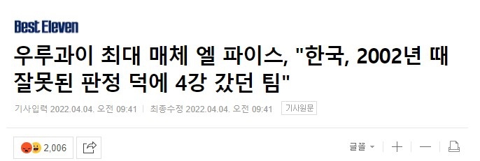 近日,2022年卡塔尔世界杯分组通过抽签的方式决出,乌拉圭与葡萄牙、韩国和加纳一齐分入H组。乌拉圭媒体《国家报》在介绍同组对手时评价了韩国在2002年日韩世界杯上的表现,韩国媒体Best Eleven予以回击,称乌媒是在诋毁韩国闯入世界杯四强的神话。