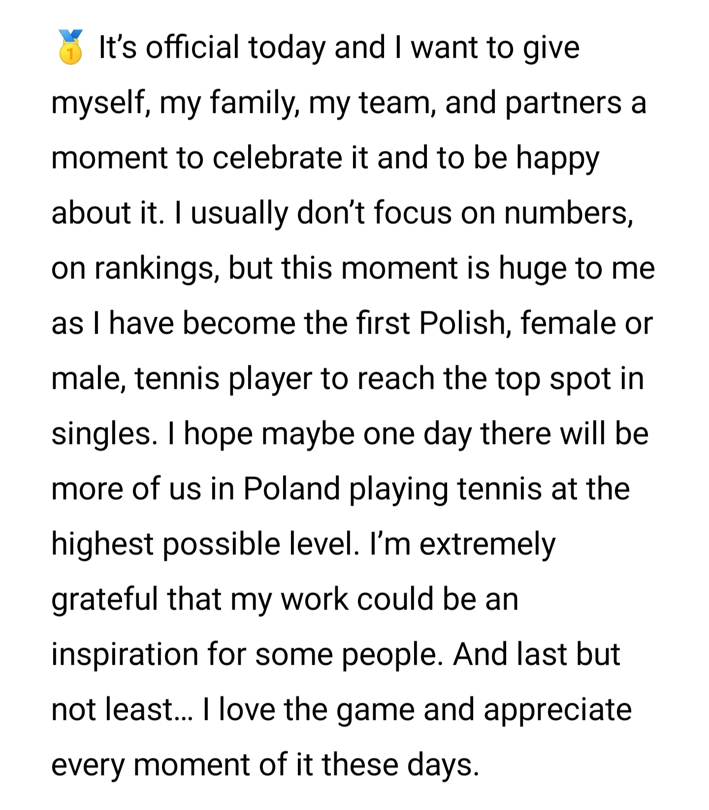 “我一般不会关心数据或者排名,但成为世界第一对我来说是非常重要的时刻。我成为波兰首位登顶单打世界第一的网球运动员。我希望有一天能有更多的波兰球员在高水平比赛中竞争。我很感激我的工作能够激励更多的人。最后也是最重要的是,我热爱网球这项运动,也感激在从事网球运动时的每一刻。”
