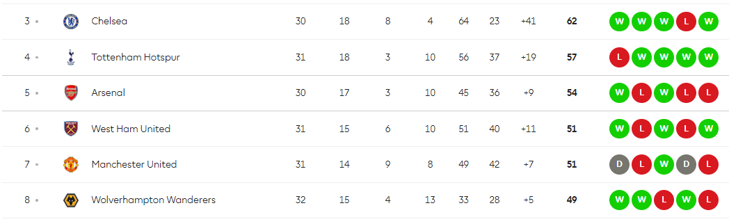 本轮英超早些时候,曼联客场0-1爆冷不敌保级队埃弗顿,争四关键一役失利,仍维持第7名;阿森纳也在迎战布莱顿的比赛中落败,位列第5;西汉姆联今晚客战布伦特福德,如果取胜,他们将与阿森纳同分,但无法超过热刺。