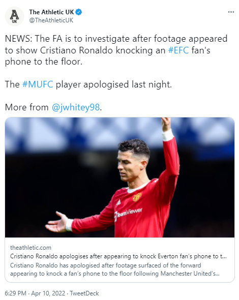 在昨天曼联客场挑战埃弗顿的比赛结束后,C罗怒摔球迷手机一事在赛后引起了轩然大波。根据外媒The Athletic的报道,英足总已经展开对此事的调查。