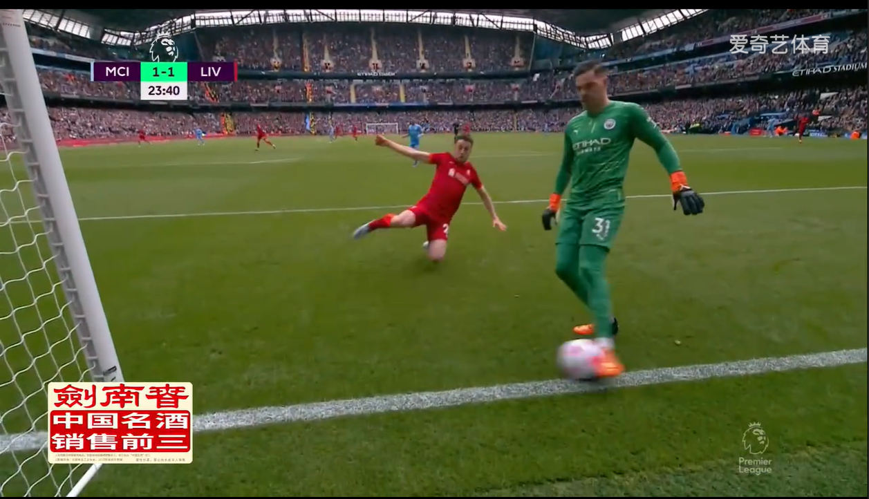 在开场双方各进一球之后,比赛在两队各自的技战术体系中流畅的进行着。曼城所擅长的后场倒脚发动进攻遭遇到了红军如狼似虎般的高位逼抢。比赛第23分钟,曼城在后场进行组织,皮球来到埃德森脚下。若塔积极的逼抢破门曼城门神在自家门前出现失误,一个踉跄险些酿成大错。不过作为蓝月亮的门将,没有出色的抗压能力以及脚下技术是不可能被瓜迪奥拉所重用的。埃德森也充分的证明了这一点,他面对红军前锋的倒地滑铲,在自己门线上不慌不忙的将球传出,化解了门前的危机。