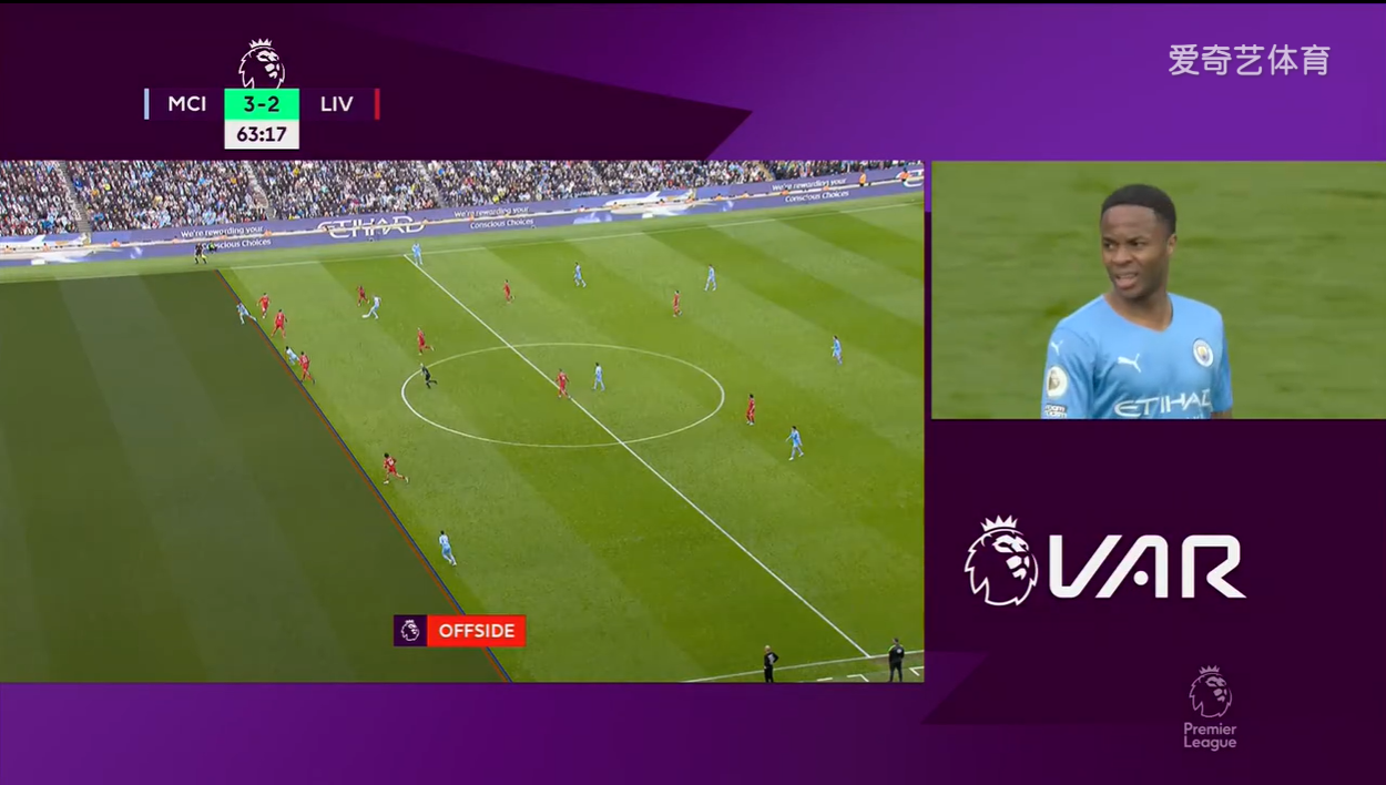 在这次防守中,同样又是马蒂普拖在了利物浦防线的最后,斯特林几乎是与他在同一水平线起跑。不过在经过VAR的划线裁定之后,斯特林的手臂相较于马蒂普的脚尖突出了一只手的距离,进球无效。