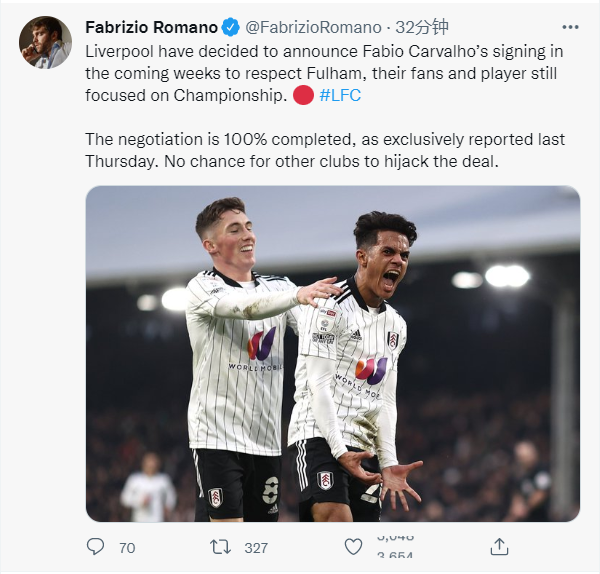 据罗马诺消息称利物浦为这位富勒姆的新星支付了约770万英镑的转会费,富勒姆还有二次转会分成的权利。这位小将将与红军签约至2027年。卡瓦略本人也在个人社交媒体点赞了加盟利物浦的新闻动态。