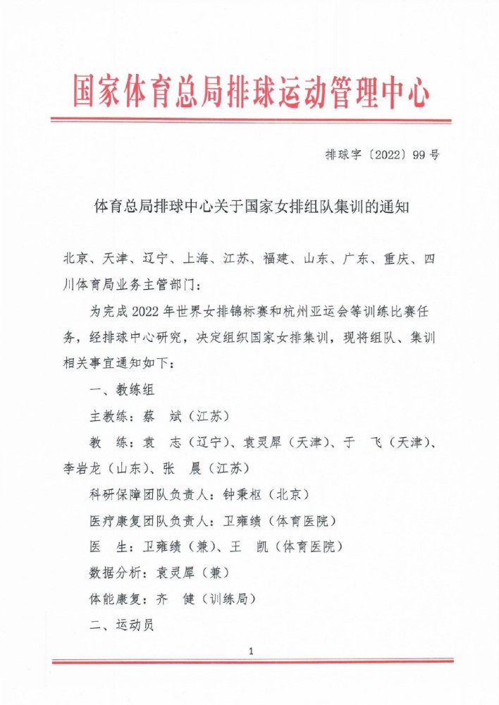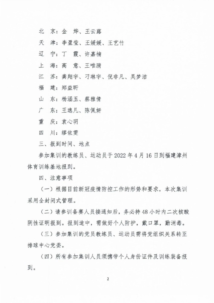 此外教练组及后勤保障团队也正式公布,参加集训的教练员和运动员将于4月16日到福建漳州体育训练基地报到。