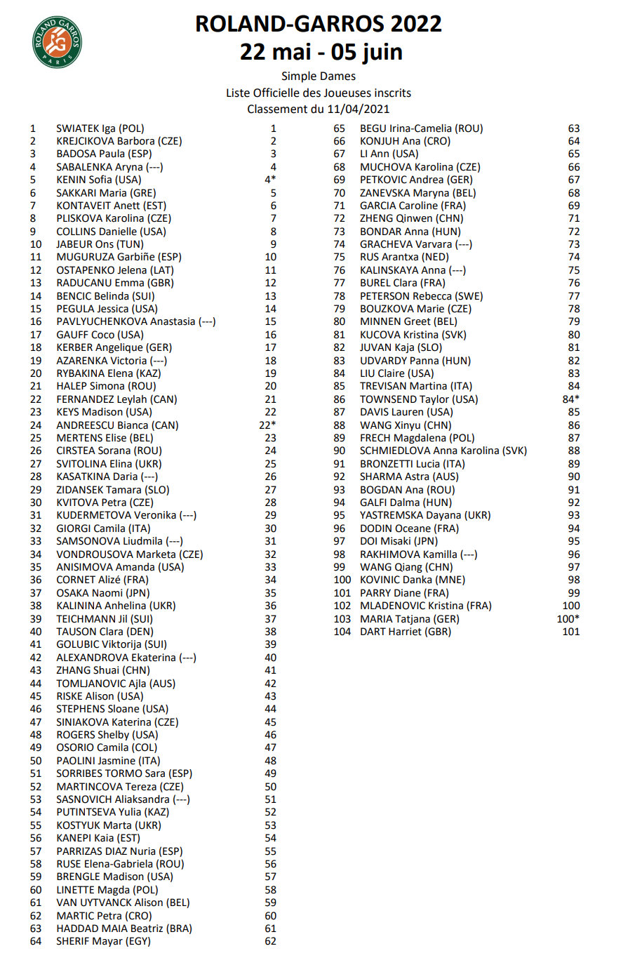 导语:2022法网女单正赛名单公布,斯瓦泰克领衔四金花直接入围