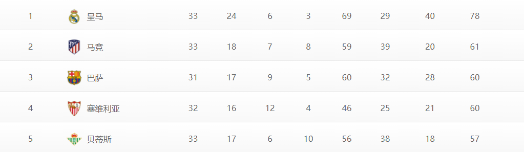 目前皇马高居西甲积分榜榜首,他们领先第二名的马竞17分,领先第三名的巴萨18分,冠军可谓脱手可得。目前在联赛还剩5轮的情况下,上赛季的冠军马竞已经彻底丧失了争夺冠军的机会。目前来看能对皇马夺冠造成悬念的仅剩下巴塞罗那一支球队,由于巴萨目前近进行了31轮比赛,所以在理论上他们还有争夺冠军的机会。