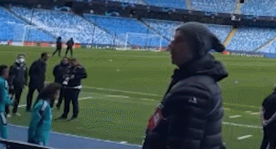 当地时间昨晚,皇马全队进入伊蒂哈德进行踩场,马塞洛与米利唐、维尼修斯一同进入场地时,不慎踩到了地上的曼城队徽。米利唐当即提醒马塞洛,后者回头发现了地上的队徽,尴尬地抱住了头: