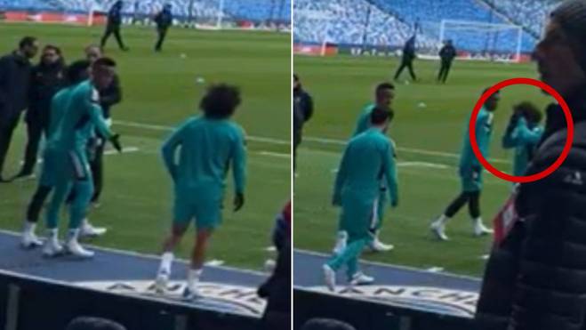 明晨欧冠皇马将在客场与曼城进行欧冠半决赛首回合角逐,赛前踩场时,皇马后卫马塞洛误踩曼城队徽,被队友米利唐提醒,立刻感到十分尴尬懊恼,双手抱头。