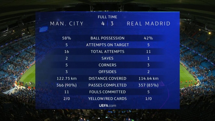 在北京时间今天凌晨结束的欧冠半决赛首回合较量当中,曼城在主场4-3小胜皇马占得晋级先机,这场顶尖的较量共产生了7粒进球,下面是本场比赛两队数据对比。