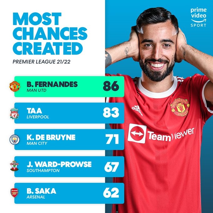 但是,已经连续7场联赛没有进球或助攻入账的B费竟然是本赛季英超创造机会数量最多的球员。在近日发表的一份统计数据中,B费在本赛季英超联赛中一共创造了86次机会,比位列第二的阿诺德多了3次,比曼城核心德布劳内更是多了足足15次!这一数据恐怕会让不少球迷大跌眼镜。