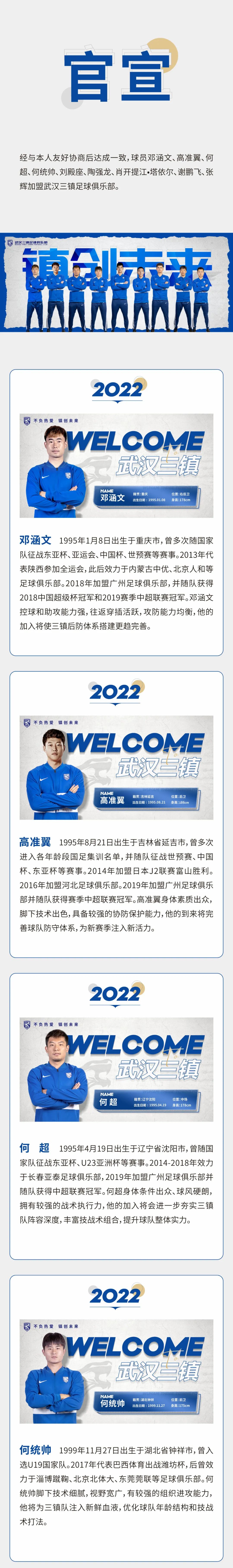 经与本人友好协商后达成一致,球员邓涵文、高准翼、何超、何统帅、刘殿座、陶强龙、肖开提江-塔依尔、谢鹏飞、张辉加盟武汉三镇足球俱乐部。