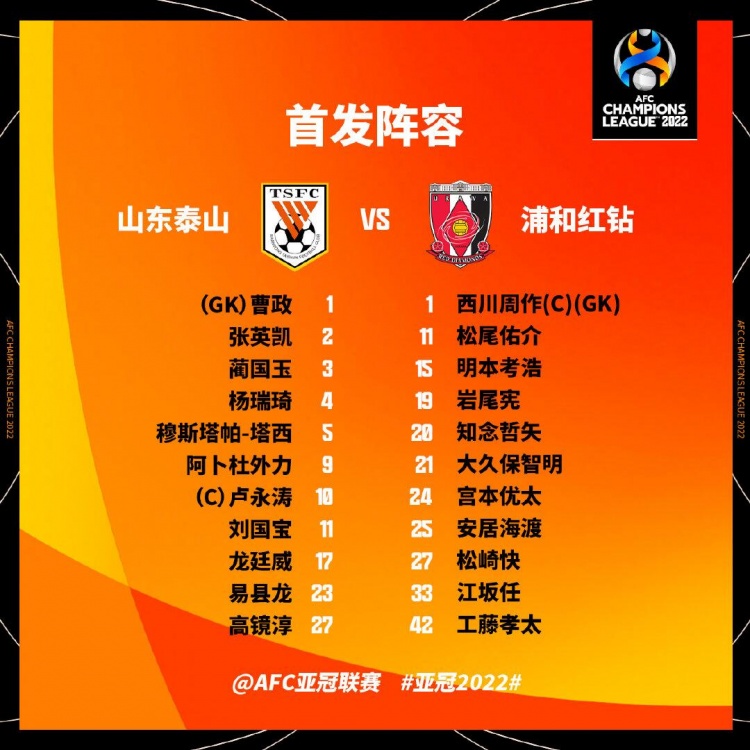 北京时间4月30日,亚冠联赛小组赛迎来最后一轮争夺,山东泰山对阵浦和红钻。赛前双方公布了本场比赛的首发名单。