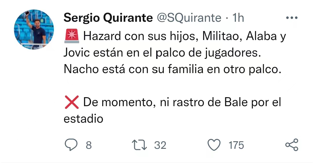 据悉,皇马其他的伤员都出现在了伯纳乌的看台上,包括米利唐、阿拉巴、约维奇、阿扎尔和纳乔。其中,阿扎尔带上了自己的孩子们,纳乔也同家人共同观战。