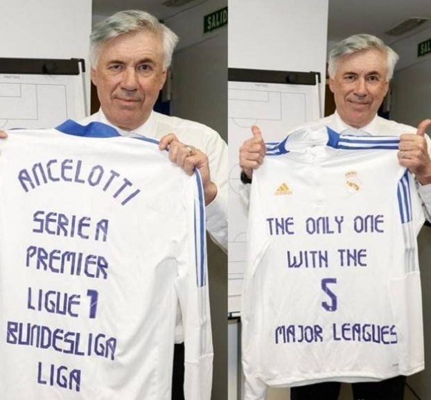 此前,安切洛蒂曾在AC米兰(2003/04赛季)、切尔西(2009/10赛季)、巴黎(2012/13赛季)、拜仁(2016/17赛季)分别带队夺得了意甲、英超、法甲和德甲的联赛冠军奖杯。实际上,安切洛蒂在2013~2015年期间也曾在皇马执掌过2个赛季的时间,但当时并未成功率队在联赛中夺冠。在今天凌晨率领皇马问鼎冠军后,他终于达成了这一难以复刻的成就,而安切洛蒂也在个人社交媒体上晒出了一件特制的皇马球衣——这件球衣的背面印有安切洛蒂赢得过的五大联赛冠军,而正面则印着“唯一赢得五大联赛全满贯之人”这句话。