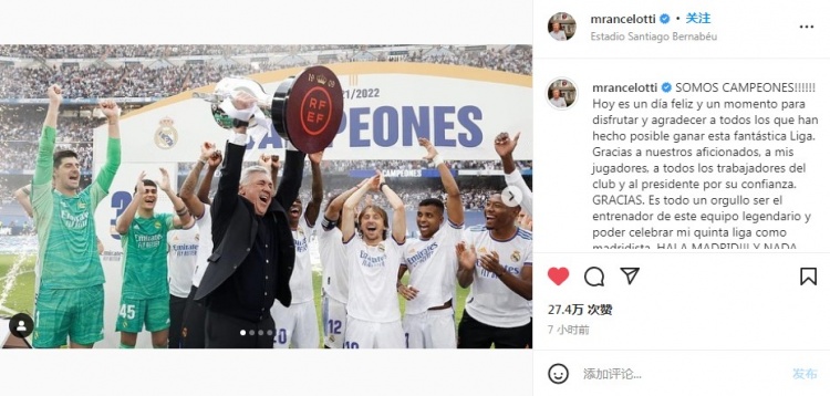 北京时间5月1日,在击败西班牙人提前获得本赛季西甲冠军后,皇马主教练安切洛蒂在个人社交媒体上庆祝了这一荣耀时刻。