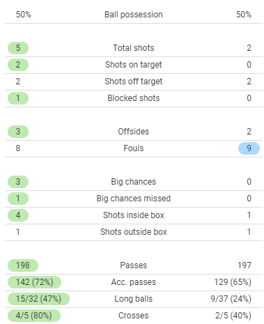 在上半场比赛中,比利亚雷亚尔打入2球,将总比分扳平。根据数据机构统计,两队上半场控球率、传球数和犯规数等数据基本相同,但射门数上黄潜5-2领先,射正次数黄潜同样2-0领先。主队两次射门均取得进球,客队没有射正。此外,黄潜创造了3次绝佳机会,错失1次。