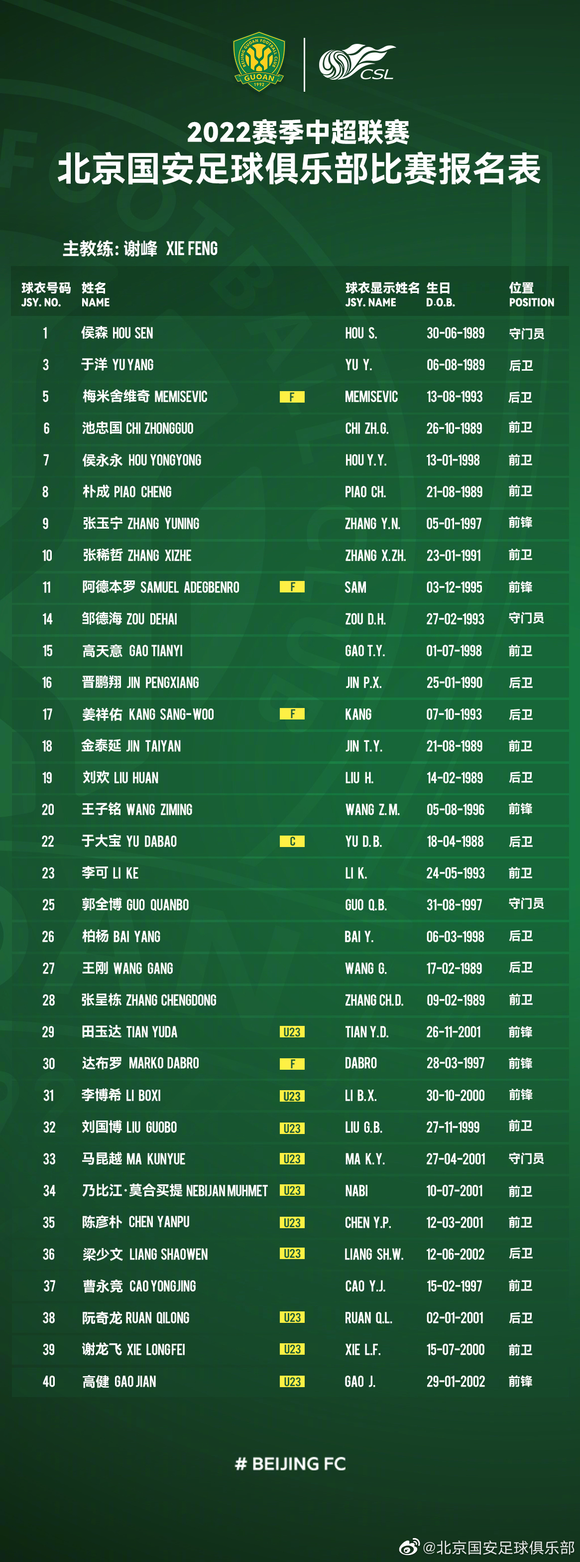 刚刚,中超球队北京国安公布了球队新赛季大名单,姜祥佑等四名外援领衔。