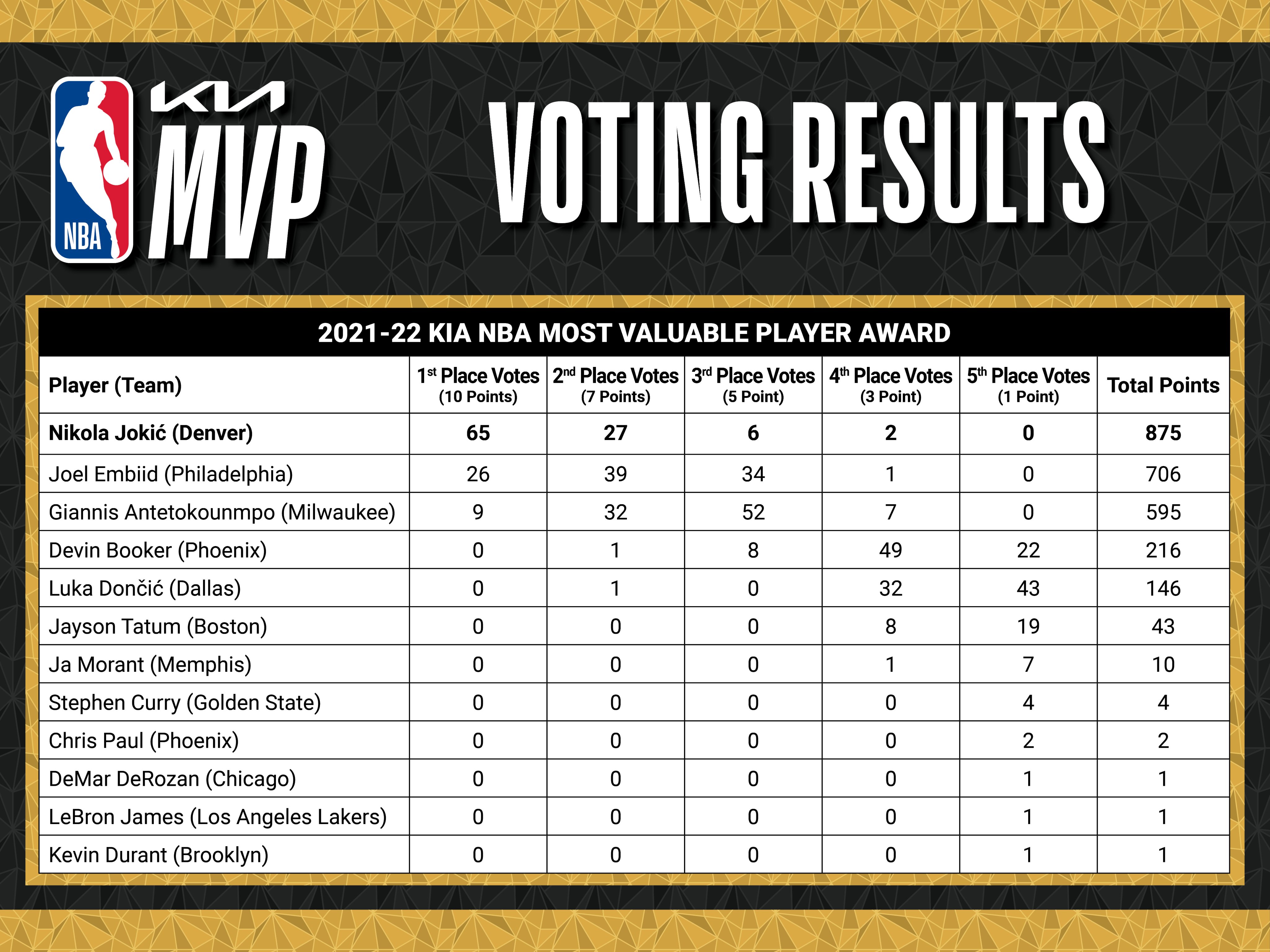 国际球员在今年的MVP投票中占据前三位。费城76人队的乔尔·恩比德,平均得分最高,获得亚军。雄鹿队的字母哥获得第三,此前在2019、2020两个赛季获得过MVP奖项。太阳队的德文·布克排名第四。