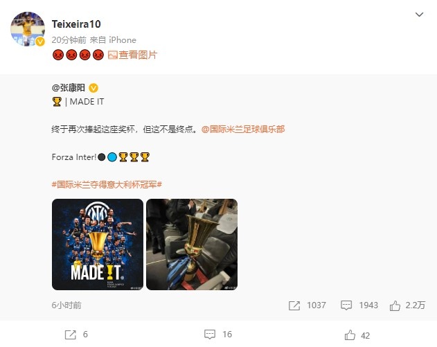 在苏宁少东家张康阳发表微博庆祝国际米兰夺冠后,不少原江苏苏宁球员都转发这条微博并呼吁苏宁集团能够尽快为他们补齐拖欠的薪水,而前苏宁外援特谢拉刚刚也加入到了这次微博讨薪的行动中来。