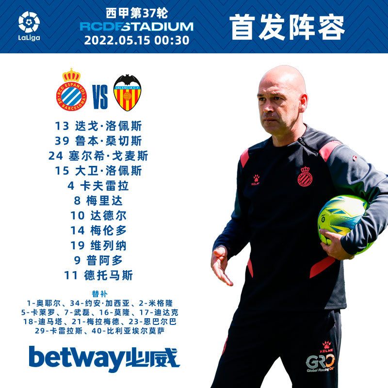 北京时间5月15日0:30,西班牙人主场迎战瓦伦西亚。目前双方首发名单已经公布。