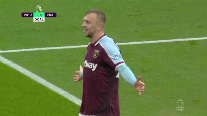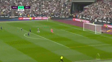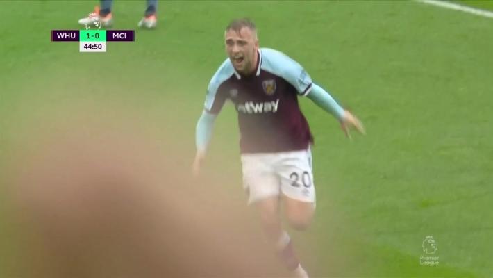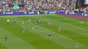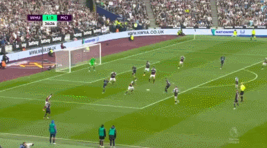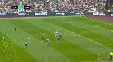 45' 鲍恩反击中接挑传再次单刀破门,西汉姆联2-0领先曼城!