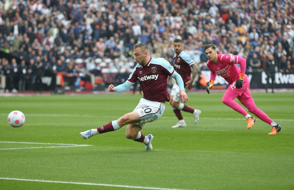 24' 鲍恩反击中单刀赴会过掉门将埃德森后小角度推射破门,西汉姆联1-0领先曼城!