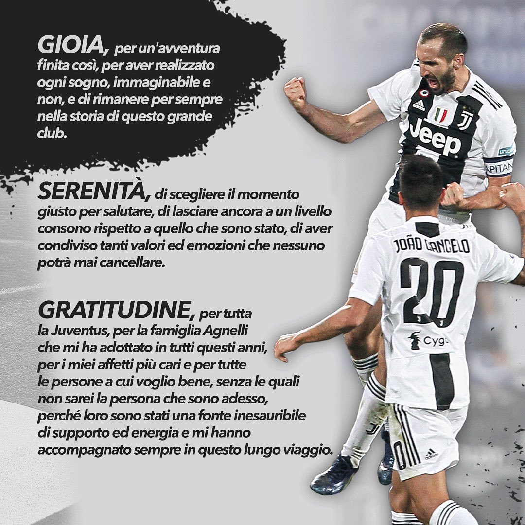 尤文图斯传奇中卫基耶利尼在本赛季结束后将离开球队,这位37岁的老将在自己的社交媒体平台发表了长文,深情地向斑马军团大家庭以及尤文蒂尼们告别。