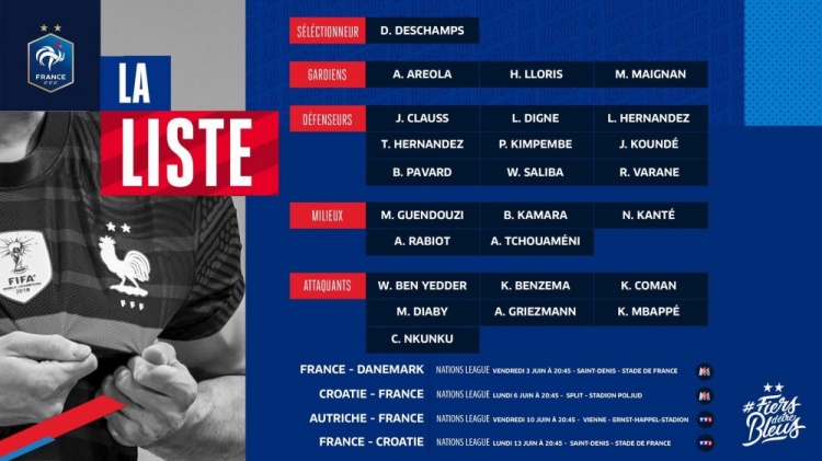 法国国家队公布了6月份欧国联大名单,本泽马、姆巴佩领衔,博格巴、吉鲁缺席,马赛中场布巴卡尔-卡马拉首次入选。