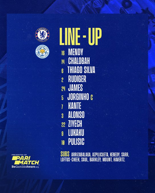 替补:1-凯帕、12-洛夫图斯-奇克、17-萨乌尔、18-巴克利、19-芒特、23-肯尼迪、28-阿斯皮利奎塔、29-哈弗茨、31-马朗-萨尔
