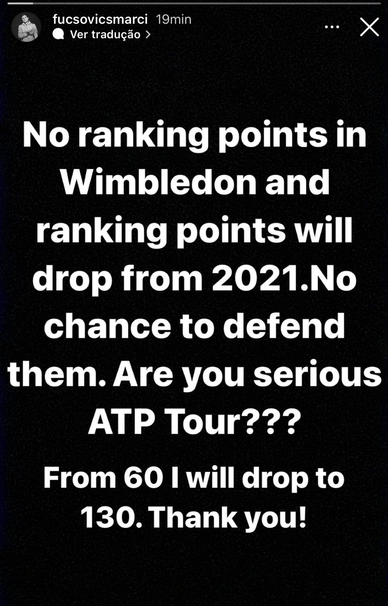“今年温网没有积分也就意味着2021年的积分将全部扣除并且没有机会保住,ATP你是认真地吗?我的排名将从60位跌到130位,真是谢谢你了!”