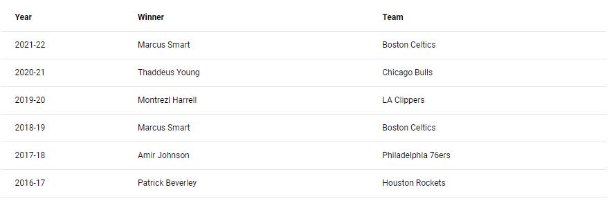 NBA最佳拼搏奖是为了表彰那些通过自己在球场上的能量和努力帮助球队赢球的球员。首届2016-17赛季得主是贝弗利,之后分别是阿米尔·约翰逊、斯玛特、哈雷尔、赛迪斯·杨和本赛季的斯玛特。