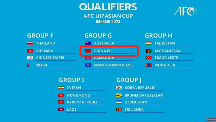 北京时间5月24日,亚足联公布了2023年U17亚洲杯预选赛的抽签结果,其中中国队被分到G组。