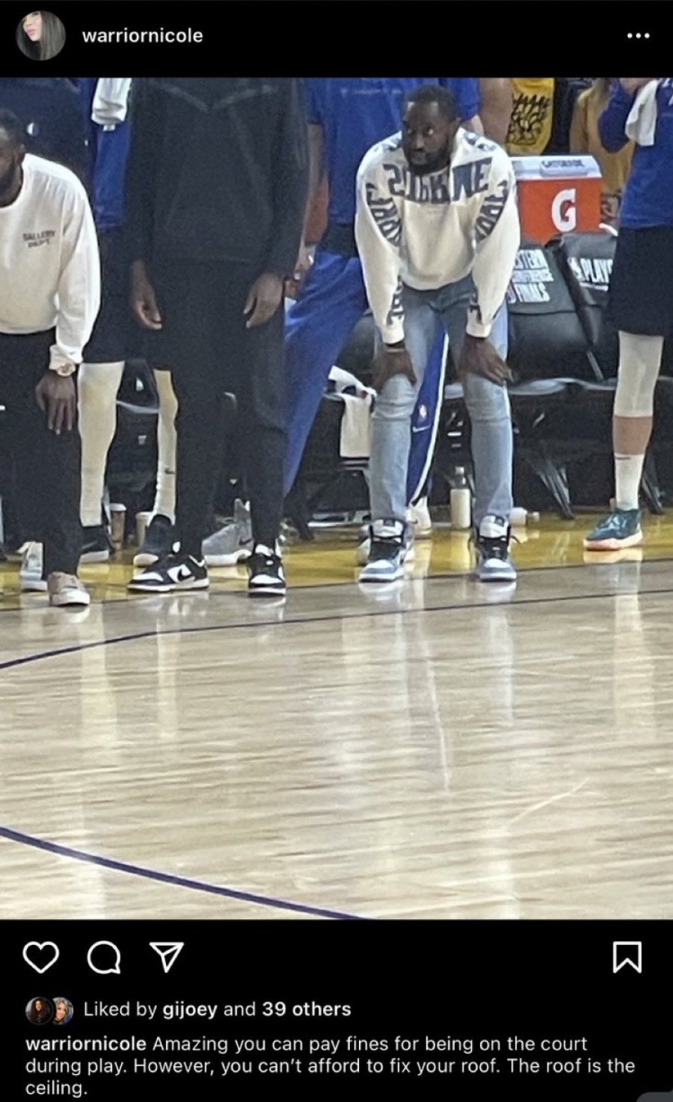 最终勇士客场不敌独行侠,大比分被对手扳为1-3.赛后勇士队老板娘妮可-拉科布在社媒吐槽了此事件,妮可晒出平森踏入球场违反联盟板凳席礼仪规定的照片并写道:“真太棒了,你们有钱为替补违规支付罚款,然而却没钱去修修主场的屋顶。这里的屋顶指的是天花板。”
